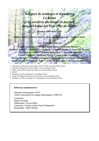 Rapport de sondages et d'analyses, Le Kilian et les carrières anciennes de trachyte dans la Chaîne des Puys (Puy-de-Dôme)