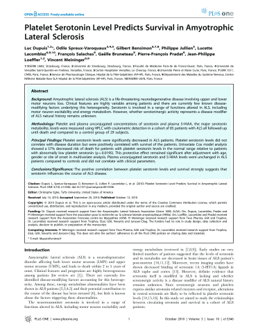 Platelet serotonin level predicts survival in amyotrophic lateral sclerosis.