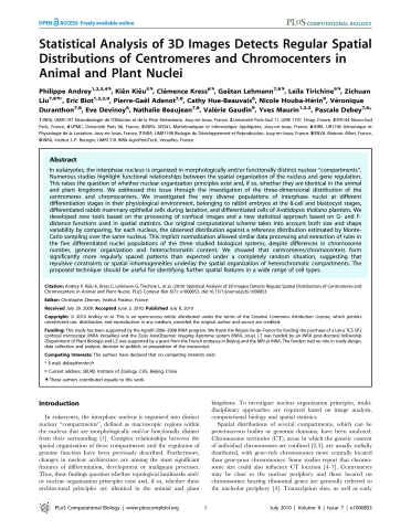 Résumé : In eukaryotes, the interphase nucleus is organized in morphologically and/or functionally distinct nuclear ‘compartments’’. Numerous studies highlight functional relationships between the spatial organization of the nucleus and gene regulation. This raises the question of whether nuclear organization principles exist and, if so, whether they are identical in the animal and plant kingdoms. We addressed this issue through the investigation of the three-dimensional distribution of the centromeres and chromocenters. We investigated five very diverse populations of interphase nuclei at different differentiation stages in their physiological environment, belonging to rabbit embryos at the 8-cell and blastocyst stages, differentiated rabbit mammary epithelial cells during lactation, and differentiated cells of Arabidopsis thaliana plantlets. We developed new tools based on the processing of confocal images and a new statistical approach based on G- and Fdistance functions used in spatial statistics. Our original computational scheme takes into account both size and shape variability by comparing, for each nucleus, the observed distribution against a reference distribution estimated by Monte- Carlo sampling over the same nucleus. This implicit normalization allowed similar data processing and extraction of rules in the five differentiated nuclei populations of the three studied biological systems, despite differences in chromosome number, genome organization and heterochromatin content. We showed that centromeres/chromocenters form significantly more regularly spaced patterns than expected under a completely random situation, suggesting that repulsive constraints or spatial inhomogeneities underlay the spatial organization of heterochromatic compartments. The proposed technique should be useful for identifying further spatial features in a wide range of cell types.