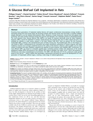 Résumé : Powering future generations of implanted medical devices will require cumbersome transcutaneous energy transfer or harvesting energy from the human body. No functional solution that harvests power from the body is currently available, despite attempts to use the Seebeck thermoelectric effect, vibrations or body movements. Glucose fuel cells appear more promising, since they produce electrical energy from glucose and dioxygen, two substrates present in physiological fluids. The most powerful ones, Glucose BioFuel Cells (GBFCs), are based on enzymes electrically wired by redox mediators. However, GBFCs cannot be implanted in animals, mainly because the enzymes they rely on either require low pH or are inhibited by chloride or urate anions, present in the Extra Cellular Fluid (ECF). Here we present the first functional implantable GBFC, working in the retroperitoneal space of freely moving rats. The breakthrough relies on the design of a new family of GBFCs, characterized by an innovative and simple mechanical confinement of various enzymes and redox mediators: enzymes are no longer covalently bound to the surface of the electron collectors, which enables use of a wide variety of enzymes and redox mediators, augments the quantity of active enzymes, and simplifies GBFC construction. Our most efficient GBFC was based on composite graphite discs containing glucose oxidase and ubiquinone at the anode, polyphenol oxidase (PPO) and quinone at the cathode. PPO reduces dioxygen into water, at pH 7 and in the presence of chloride ions and urates at physiological concentrations. This GBFC, with electrodes of 0.133 mL, produced a peak specific power of 24.4 microW mL(-1), which is better than pacemakers' requirements and paves the way for the development of a new generation of implantable artificial organs, covering a wide range of medical applications.