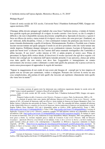 Résumé : reti-sapere-territorio, ENS Chiunque abbia dovuto spiegare agli studenti che cosa fosse l'inchiesta storica, o tentato di fornire loro qualche regola per permettergli di svolgere in modo corretto i loro lavori, sa che il compito è difficile e che non è disponibile nessuna descrizione semplificativa. Sperando di riuscirci, e questo è forse un riflesso da storico, siamo tentati di rivolgerci verso coloro che sono presi per i fondatori, un po' mitizzati, della disciplina, i Greci, e i loro continuatori romani che praticano una historia il cui nome rimanda direttamente a quello di inchiesta. Sfortunatamente, Erodoto o Tucidide non ci hanno lasciato nessun trattato nel quale spiegano il modo in cui deve procedere colui che vuole tentare una simile impresa. Dobbiamo dunque ripiegare su un continuatore romano, Luciano di Samosata, sul quale dei buoni testi 3 ci dicono che sia l'autore dell'unico manuale storiografico che l'antichità ci abbia lasciato. Il suo testo 4 , scritto intorno al 165, si adatta proprio al nostro caso. Prima di presentarci la figura dello storico ideale, di descriverci il modus operandi che egli deve seguire e di fornirci dei consigli per la redazione dell'opera tenendo presente il suo percorso, elenca per prima cosa tutto quello che uno storico non deve fare. Leggendolo ci immaginiamo un canuto universitario che inveisce contro i dilettanti o contro tutti quelli che pensano che si possa scrivere la storia senza preoccuparsi di apprendere le regole del mestiere: " Eppure la maggioranza di noi crede di non avere più bisogno di consigli per la loro impresa di quanti non ne servano per camminare, vedere o mangiare. Pensano che scrivere la storia sia una cosa semplicissima, alla portata di tutti quelli che riescono ad esprimere chiaramente tutto quello che viene loro in mente 5 ".