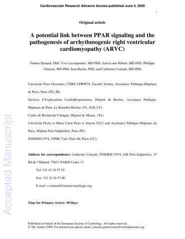 A potential link between PPAR signaling and the pathogenesis of arrhythmogenic right ventricular cardiomyopathy (ARVC) Time for Primary review: 50 Days Cardiovascular Research Advance