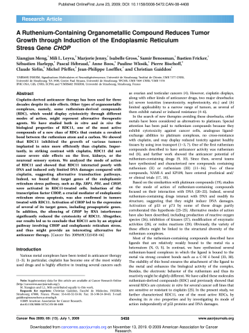 Résumé : Cisplatin-derived anticancer therapy has been used for three decades despite its side effects. Other types of organometallic complexes, namely, some ruthenium-derived compounds (RDC), which would display cytotoxicity through different modes of action, might represent alternative therapeutic agents. We have studied both in vitro and in vivo the biological properties of RDC11, one of the most active compounds of a new class of RDCs that contain a covalent bond between the ruthenium atom and a carbon. We showed that RDC11 inhibited the growth of various tumors implanted in mice more efficiently than cisplatin. Importantly, in striking contrast with cisplatin, RDC11 did not cause severe side effects on the liver, kidneys, or the neuronal sensory system. We analyzed the mode of action of RDC11 and showed that RDC11 interacted poorly with DNA and induced only limited DNA damages compared with cisplatin, suggesting alternative transduction pathways. Indeed, we found that target genes of the endoplasmic reticulum stress pathway, such as Bip, XBP1, PDI, and CHOP, were activated in RDC11-treated cells. Induction of the transcription factor CHOP, a crucial mediator of endoplasmic reticulum stress apoptosis, was also confirmed in tumors treated with RDC11. Activation of CHOP led to the expression of several of its target genes, including proapoptotic genes. In addition, the silencing of CHOP by RNA interference significantly reduced the cytotoxicity of RDC11. Altogether, our results led us to conclude that RDC11 acts by an atypical pathway involving CHOP and endoplasmic reticulum stress, and thus might provide an interesting alternative for anticancer therapy.
