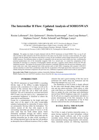 Résumé : We update two kinds of results obtained with the SWAN instrument on board SOHO. First, we use H cell data recorded in 2001 and derive the H flow direction in the same way the study was done at solar minimum. We again compare with the Helium flow direction and doing so correct for the coordinate system change between the Ulysses and SOHO missions. The deflection plane we obtain is compatible with our previous result within error bars, confirming the potential predominant role of the interstellar magnetic field. In a second part, we extend the computation of the interstellar H ionization as a function of heliographic latitude and time, a quantity which reflects closely the SW flux latitudinal structure. The pattern for the present solar minimum is strikingly different from the previous minimum, with a much wider slow solar wind equatorial belt which persists until at least 2008. Comparing with synoptic LASCO/C2 electron densities we infer from a preliminary study that the acceleration of the high speed solar wind occurs at a higher altitude during this minimum compared to the previous one, a difference expansion models must be able to reproduce.