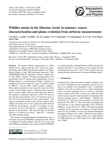 Résumé : We present airborne measurements of carbon dioxide (CO2), carbon monoxide (CO), ozone (O3), equivalent black carbon (EBC) and ultra fine particles over North-Eastern Siberia in July 2008 performed during the YAK-AEROSIB/POLARCAT experiment. During a "golden day" (11 July 2008) a number of biomass burning plumes were encountered with CO concentration enhancements of up to 500 ppb relative to a background of 90 ppb. Number concentrations of aerosols in the size range 3.5–200 nm peaked at 4000 cm−3 and the EBC content reached 1.4 μg m−3. These high concentrations were caused by forest fires in the vicinity of the landing airport in Yakutsk where during the descent measurements in fresh smoke could be made. We estimate a combustion efficiency of 90±3% based on CO and CO2 measurements. The emission factor of CO emitted was 59.6±15.2 g CO per kilogram of dry matter burned, suggesting an increase in the average northern hemispheric CO concentration of 3.0–7.2 ppb per million hectares of Siberian forest burned. For BC, we estimate an emission factor of 0.52±0.07 g BC kg−1, comparable to values reported in the literature. The emission ratio of ultra-fine particles (3.5–200 nm) was 26 cm−3 (ppb CO)−1, consistent with other airborne studies.
