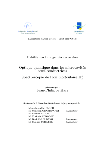 Résumé : Je présente dans une première partie mes travaux de recherche sur les microcavités semi-conductrices en régime de couplage fort exciton-photon. Les modes propres dans ces systèmes sont des états mixtes exciton-photon appelés polaritons de cavité, qui présentent de fortes non-linéarités optiques provenant de l'interaction exciton-exciton. Je présente plusieurs applications de ces dispositifs dans les domaines de l'optique quantique (compression du bruit quantique, génération de faisceaux corrélés) des communications optiques et de l'opto-électronique de spin. J'aborde dans la deuxième partie mes activités théorique et expérimentale autour de la spectroscopie de l'ion H2+. Le but de l'expérience, qui a débuté en 2003 à l'université d'Evry, est de mesurer la fréquence d'une transition vibrationnelle à deux photons sans effet Doppler, et de la comparer à des prédictions théoriques précises pour en déduire une nouvelle détermination du rapport mp/me. Je décris les progrès des calculs de haute précision sur l'ion H2+ (niveaux d'énergie non relativistes, structure hyperfine), ainsi que le dispositif expérimental mis en place et les perspectives de l'expérience.