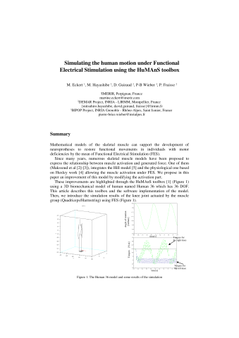Résumé : Mathematical models of the skeletal muscle can support the development of neu-roprotheses to restore functional movements in individuals with motor deficien-cies by the means of Functional Electrical Stimulation (FES). Since many years, numerous skeletal muscle models have been proposed to express the relationship between muscle activation and generated force. One of them (Makssoud et al [2]-[3]), integrates the Hill model [5] and the physiological one based on Huxley work [4] allowing the muscle activation under FES. We propose in this paper an impro-vement of this model by modifying the activation part. These improvements are highlighted through the HuMAnS toolbox [1] using a 3D biomechanical model of human named Human 36. This article describes this toolbox and the software implementation of the model. Then, we present the results of the simulation.