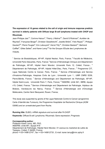 Résumé : Gene expression profiles have been associated with clinical outcome in patients with diffuse large B-cell lymphoma (DLBCL) treated with anthracycline-containing chemotherapy. Using Affymetrix HU133A microarrays, we analyzed the lymphoma transcriptional profile of 30 patients treated with CHOP (cyclophosphamide, doxorubicin, vincristine, prednisone) and 23 patients treated with rituximab (R)-CHOP in the Groupe d'Etude des Lymphomes de l'Adulte clinical centers. We used this data set to select transcripts showing an association with progression-free survival in all patients or showing a differential effect in the two treatment groups. We performed real-time quantitative reverse transcription-PCR in the 23 R-CHOP samples of the screening set and an additional 44 R-CHOP samples set to evaluate the prognostic significance of these transcripts. In these 67 patients, the level of expression of 16 genes and the cell-of-origin classification were significantly associated with overall survival, independently of the International Prognostic Index. A multivariate model comprising four genes of the cell-of-origin signature (LMO2, MME, LPP and FOXP1) and two genes related to immune response, identified for their differential effects in R-CHOP patients (APOBEC3G and RAB33A), demonstrated a high predictive efficiency in this set of patients, suggesting that both features affect outcome in DLBCL patients receiving immunochemotherapy.