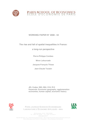 Résumé : This paper uses a unique database that provides value-added, employment, and population levels for the entire set of French departments for the years 1860, 1930, and 2000. These data cover three sectors: agriculture, manufacturing, and services. This allows us to study the evolution of spatial inequalities within France and to test the empirical relevance of economic geography predictions over the long run. The evidence confirms the existence of a bell-shaped evolution of the spatial concentration of manufacturing and services. In contrast, labor productivity has been converging across departments. Last, our study also confirms the presence of strong agglomeration economies during the full time-period. Market potential during the first sub-period (1860-1930), and higher education during the second (1930-2000), together with sectoral diversity, account for the spatial distribution of these gains.