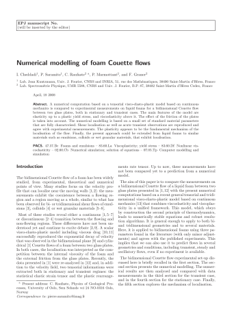 Résumé : In this paper, a numerical simulation based on a tensorial elastoviscoplastic model is compared to experimental measurements on liquid foams for a bidimensional Couette flow, both in stationary and transient cases. The main features of of the model are elasticity up to a plastic yield stress and viscoelasticity above. The numerical modelling bases on a small set of standard material parameters that could be fully characterised. Shear localisation as well as fine transient observations are reproduced and are found to be in good agreement with experimental measurements. The effect of the friction of plates is taken into account. The plasticity appears to be the fundamental mechanism of the localisation of the flow. Finally, the present approach could be extended from liquid foams to similar materials such as emulsions, colloids or wet granular materials, that exhibits localisations.