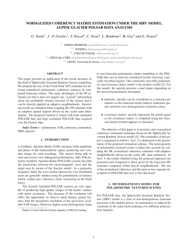 Résumé : This paper presents an application of the recent advances in the field of Spherically Invariant Random Vectors modelling. We propose the use of the Fixed Point (FP) estimator for deriving normalized polarimetric coherency matrices in compound Gaussian clutter. The main advantages of the FP estimator are that it does not require any "a priori" information about the probability density function of the texture and it can be directly applied on adaptive neighborhoods. Interesting results are obtained when coupling this FP estimator with an adaptive spatial support driven on the scalar span information. The proposed method is tested with both simulated POLSAR data and high resolution POLSAR data acquired over the French Alps.