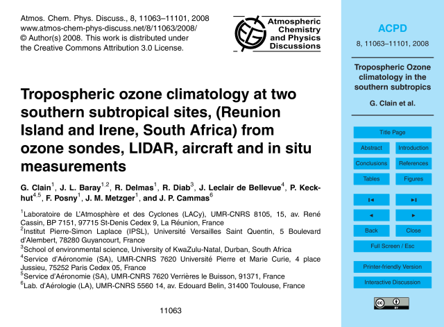Résumé : This paper presents a climatology and trends of tropospheric ozone in the southwestern part of Indian Ocean (Reunion Island) and South Africa (Irene and Johannesburg). This study is based on a multi-instrumental dataset: PTU-O