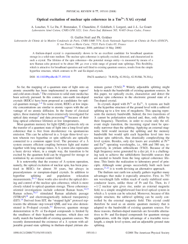 Résumé : A thulium-doped crystal is experimentally shown to be an excellent candidate for broadband quantum storage in a solid-state medium. For the first time, nuclear spin coherence is optically excited, detected and characterized in such a crystal. The lifetime of the spin coherence -- the potential storage entity -- is measured by means of Raman echo to be about 300~$\mu$s over a wide range of ground state splittings. This flexibility, attractive for broadband operation, and well fitted to existing quantum sources, results from the simple hyperfine structure, contrasting with Pr- and Eu- doped crystals.