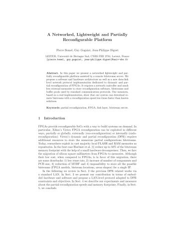 Résumé : In this paper we present a networked lightweight and par- tially reconfigurable platform assisted by a remote bitstreams server. We propose a software and hardware architecture as well as a new data-link level network protocol implementation dedicated to dynamic and par- tial reconfiguration of FPGAs. It requires a network controller and much less external memories to store reconfiguration software, bitstreams and buffer pools used by standard communication protocols. Our measures, based on a real implementation, show that our system can download re- mote bistreams with a reconfiguration speed ten times faster than known solutions.