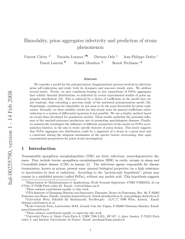 Résumé : We consider a model for the polymerization (fragmentation) process involved in infectious prion self-replication and study both its dynamics and non-zero steady state. We address several issues. Firstly, we give conditions leading to size repartitions of PrPsc aggregates that exhibit bimodal distributions, as indicated by recent experimental studies of prion aggregates distribution. Secondly, we show stability results for this steady state for general coefficients where reduction to a system of differential equations is not possible. We use a duality method based on recent ideas developed for population models. These results underline the potential influence of the amyloid precursor production rate in promoting amyloidogenic diseases. Finally, we numerically investigate the influence of different parameters of the model on PrPsc accumulation kinetics, in the aim to study specific features of prion strains.