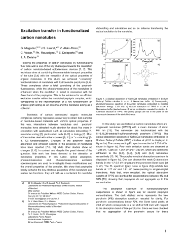 Résumé : Tailoring the properties of carbon nanotubes by functionalizing their side-wall is one of the key challenges towards the realization of carbon nanotube-based optoelectronic devices. This technique aims at combining the remarkable transport properties of the tube with the versatility of the optical properties of organic molecules. Herein, we achieve p-stacking functionalization of nanotubes with hydrosoluble porphyrins.