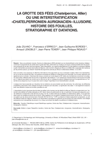 Résumé : Dans une publication récente, Gravina et collaborateurs (2005) admettent qu'une interstratification entre industries châtelperroniennes et aurignaciennes est avérée dans la grotte des Fées, phénomène qui implique une longue contemporanéité entre les populations porteuses de ces deux technocomplexes. Cette interprétation, qui s'appuie essentiellement sur des datations numériques réalisées à partir d'échantillons provenant des fouilles de Delporte, a été vivement critiquée par Zilhao et al. (2006). Elle a cependant été maintenue par les premiers auteurs, qui réfutent l'ensemble des arguments avancés par Zilhao et collaborateurs (Mellars et al. 2007). Dans cet article, nous exposons en détail les informations et les arguments qui nous conduisent à rejeter l'idée d'une interstratification sur le site de la grotte des Fées. Les questions soulevées par Mellars et colaborateurs sont discutées. De nouveaux éléments sont également pris en compte. L'historique des travaux conduits sur le site depuis le XIXe siècle, les incohérences concernant la localisation des fouilles, différente selon les sources, la signification des datations 14 C et l'analyse de l'industrie lithique et de la parure recueillie par H. Delporte permettent de montrer que ce site livre en fait un mélange de pièces châtelperroniennes et aurignaciennes sur l'ensemble de sa séquence et qu'il ne peut donc servir à étayer l'hypothèse d'une interstratification culturelle. L'analyse de la faune associée aux industries met en évidence une accumulation par des carnivores. Sur cette base, les différentes possibilités d'association entre vestiges fauniques et lithiques sont discutées. La signification des dates 14 C est également évaluée à partir des différents modes de formation possibles du site. L'interprétation la plus rigoureuse des données recueillies incite à penser que les dépôts fouillés par Delporte correspondent pour l'essentiel à des déblais de fouilles pratiquées au XIXe siècle. Seule une petite partie du site, en particulier à la base de la séquence, pourrait réellement correspondre à des témoins en place. Sur les 13 dates obtenues par Mellars et collaborateurs (2007), 10 ont été réalisées à partir de vestiges provenant de ce témoin. Elles suggèrent une occupation châtelperronienne autour de 39-40 ka 14 C BP et une occupation par les seuls carnivores dans l'intervalle 36,5 ka-34,5 ka 14 C BP. La présence d'objets typiquement aurignaciens, au sein des déblais fouillés par Delporte, atteste d'une fréquentation sporadique du gisement par les porteurs de cette industrie. Ces vestiges aurignaciens sont susceptibles de provenir d'un niveau surmontant les dépôts moustériens et châtelperroniens.