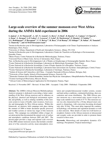 Résumé : The AMMA (African Monsoon Multidisciplinary Analysis) program is dedicated to providing a better understanding of the West African monsoon and its influence on the physical, chemical and biological environment regionally and globally, as well as relating variability of this monsoon system to issues of health, water resources, food security and demography for West African nations. Within this framework, an intensive field campaign took place during the summer of 2006 to better document specific processes and weather systems at various key stages of this monsoon season. This campaign was embedded within a longer observation period that documented the annual cycle of surface and atmospheric conditions between 2005 and 2007. The present paper provides a large and regional scale overview of the 2006 summer monsoon season, that includes consideration of of the convective activity, mean atmospheric circulation and synoptic/intraseasonal weather systems, oceanic and land surface conditions, continental hydrology, dust concentration and ozone distribution. The 2006 African summer monsoon was a near-normal rainy season except for a large-scale rainfall excess north of 15° N. This monsoon season was also characterized by a 10-day delayed onset compared to climatology, with convection becoming developed only after 10 July. This onset delay impacted the continental hydrology, soil moisture and vegetation dynamics as well as dust emission. More details of some less-well-known atmospheric features in the African monsoon at intraseasonal and synoptic scales are provided in order to promote future research in these areas.