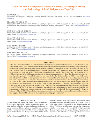 Résumé : After the demonstration that no Châtelperronian/Aurignacian interstratifications existed at Roc-de-Combe, Le Piage, and El Pendo, the Grotte des Fées remained the single instance conceivably documenting the putative longterm regional contemporaneity of the two technocomplexes which is required by the “acculturation” and “imitation” models of the innovations (ornaments, decorated bone tools) that characterize the Châtelperronian. Based on our own inspection and study of the lithic and faunal collections and of the site itself, on consideration of the published and unpublished literature, and on the available dating evidence, we show that the putative interstratified deposits reported by Henri Delporte, who last excavated at the Grotte des Fées in 1951–54 and 1962, are in fact 19th-century backfill. In situ remnants may have been found in 1962, but, in the part of the site excavated at that time, Delporte failed to recognize the previously described interstratification. The stratigraphic consistency of 10 (out of the 13) radiocarbon dates available relates to the fact that those 10 dates are on samples from the conceivably in situ remnants excavated in 1962. Three samples from Level B5 date the Châtelperronian occupation to ca 39–40,000 14C BP, while seven samples from Level B1–3 relate to carnivore denning at the site throughout the ca 36,500–34,500 14C BP interval. Subsequent sporadic incursions by bearers of an Aurignacian I tool-kit are documented by diagnostic material scattered from top to bottom of the backfill deposits excavated by Delporte between 1951 and 1954. Originally, that Aurignacian material must have been contained in a surficial occupation lens capping the site's Mousterian-to-Châtelperronian stratigraphic succession.
