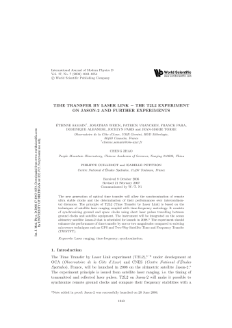 Résumé : The new generation of optical time transfer will allow the synchronization of remote ultra stable clocks and the determination of their performances over intercontinen-tal distances. The principle of T2L2 (Time Transfer by Laser Link) is based on the techniques of satellite laser ranging coupled with time-frequency metrology. It consists of synchronizing ground and space clocks using short laser pulses travelling between ground clocks and satellite equipment. The instrument will be integrated on the ocean altimetry satellite Jason-2 that is scheduled for launch in 2008. a The experiment should enhance the performance of time transfer by one or two magnitudes compared to existing microwave techniques such as GPS and Two-Way Satellite Time and Frequency Transfer (TWSTFT).
