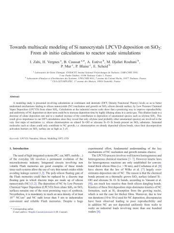 Résumé : A modeling study is presented involving calculations at continuum and atomistic (DFT, Density Functional Theory) levels so as to better understand mechanisms leading to silicon nanocrystals (NC) nucleation and growth on SiO2 silicon dioxide surface, by Low Pressure Chemical Vapor Deposition (LPCVD) from silane SiH4. Calculations at the industrial reactor scale show that a promising way to improve reproducibility and uniformity of NC deposition at short term could be to increase deposition time by highly diluting silane in a carrier gas. This dilution leads to a decrease of silane deposition rate and to a marked increase of the contribution to deposition of unsaturated species such as silylene SiH2. This result gives importance to our DFT calculations since they reveal that only silylene (and probably other unsaturated species) are involved in the very first steps of nucleation i.e. silicon chemisorption on silanol Si–OH or siloxane Si–O–Si bonds present on SiO2 substrates. Saturated molecules such as silane could only contribute to NC growth, i.e. chemisorption on already deposited silicon bonds, since their decomposition activation barriers on SiO2 surface are as high as 3 eV.