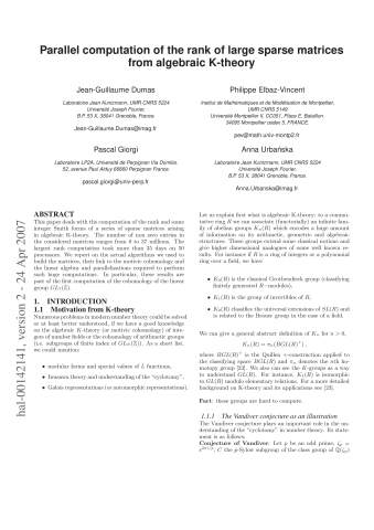 Résumé : This paper deals with the computation of the rank and of some integer Smith forms of a series of sparse matrices arising in algebraic K-theory. The number of non zero entries in the considered matrices ranges from 8 to 37 millions. The largest rank computation took more than 35 days on 50 processors. We report on the actual algorithms we used to build the matrices, their link to the motivic cohomology and the linear algebra and parallelizations required to perform such huge computations. In particular, these results are part of the first computation of the cohomology of the linear group GL_7(Z).