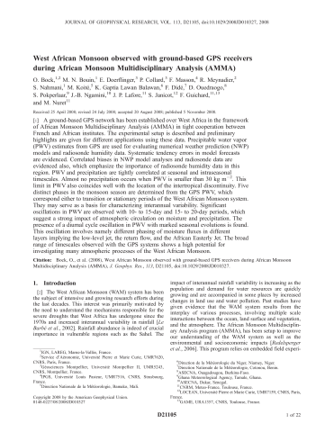 • Auteurs : Olivier BockMarie-Noëlle BouinE. DoerflingerP. CollardF. MassonRémi MeynadierSamuel NahmaniM. KoitéK. Gaptia Lawan BalawanFrancis DidéD. OuedraogoS. PokperlaarJean-Blaise NgaminiJean-Philippe LaforeSerge JanicotFrancoise GuichardMathieu Nuret
