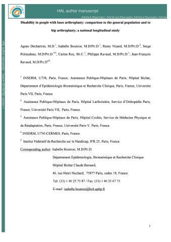 Résumé : OBJECTIVE: To describe disability in individuals with hip arthroplasty and its evolution over 2 years compared with that in the general population, and to compare the degree of disability between subjects with recent and older hip arthroplasty. METHODS: We selected a national representative sample of 16,945 subjects from the 1999 French population census. This sample, interviewed in 1999 and 2001 about their level of disability, included 527 subjects with hip arthroplasty (i.e., representing 424,000 individuals in the French noninstitutionalized population): 145 who underwent the procedure between 1999 and 2001 (recent hip arthroplasty) and 382 with an older hip arthroplasty. RESULTS: Subjects with hip arthroplasty reported more difficulty in bending forward (odds ratio [OR] 4.5, 95% confidence interval [95% CI] 3.1-6.6), climbing stairs (OR 2.2, 95% CI 1.5-3.1), walking >300 meters (OR 1.6, 95% CI 1.03-2.6), dressing (OR 2.9, 95% CI 2.1-4.2), and getting in and out of a chair (OR 2.5, 95% CI 1.7-3.6) than the general population. However, the evolution in disability was similar to that of the general population. Compared with subjects with older hip arthroplasty, those with recent hip arthroplasty reported more difficulty walking >300 meters (OR 2.7, 95% CI 1.3-5.6), washing (OR 2.9, 95% CI 1.6-5.4), dressing (OR 2.2, 95% CI 1.2-4.2), and getting in and out of a chair (OR 2.1, 95% CI 1.1-3.9). CONCLUSION: This study describes the potential future disability in the more elderly population, with implications for health-related planning.