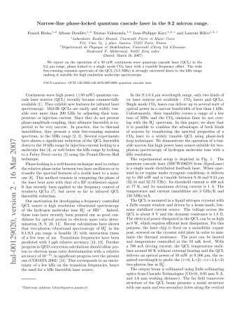Résumé : We report on the operation of a 50~mW continuous wave quantum cascade laser (QCL) in the 9.2 micrometer range, phase locked to a single mode CO2 laser with a tunable frequency offset. The wide free running emission spectrum of the QCL (3-5~MHz) is strongly narrowed down to the kHz range making it suitable for high resolution molecular spectroscopy.