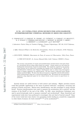 Résumé : The accuracy and precision of current atom-interferometric inertialsensors rival state-of-the-art conventional devices using artifact-based test masses . Atomic sensors are well suited for fundamental measurements of gravito-inertial fields. The sensitivity required to test gravitational theories can be achieved by extending the baseline of the interferometer. The I.C.E. (Interférométrie Cohérente pour l'Espace) interferometer aims to achieve long interrogation times in compact apparatus via reduced gravity. We have tested a cold-atom source during airplane parabolic flights. We show that this environment is compatible with free-fall interferometric measurements using up to 4 second interrogation time. We present the next-generation apparatus using degenerate gases for low release-velocity atomic sources in space-borne experiments.