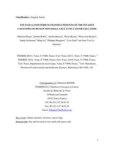 Résumé : Ionic channel activity is involved in fundamental cellular behaviour and participates in cancerous features such as proliferation, migration and invasion which in turn contribute to the metastatic process. In this study, we investigated the expression and role of voltage-gated sodium channels in non-small-cell lung cancer cell lines. Functional voltage-gated sodium channels expression was investigated in normal and non-small-cell lung cancer cell lines. The measurement, in patch-clamp conditions, of tetrodotoxin-inhibitable sodium currents indicated that the strongly metastatic cancerous cell lines H23, H460 and Calu-1 possess functional sodium channels while normal and weakly metastatic cell lines do not. While all the cell lines expressed mRNA for numerous sodium channel isoforms, only H23, H460 and Calu-1 cells had a 250 kDa protein corresponding to the functional channel. The other cell lines also had another protein of 230 kDa which is not addressed to the membrane and might act as a dominant negative isoform to prevent channel activation. At the membrane potential of these cells, channels are partially open. This leads to a continuous entry of sodium, disrupting sodium homeostasis and down-stream signaling pathways. Inhibition of the channels by tetrodotoxin was responsible for a 40-50% reduction of in vitro invasion. These experiments suggest that the functional expression of voltage-gated sodium channels might be an integral component of the metastatic process in non-small-cell lung cancer cells probably through its involvement in the regulation of intracellular sodium homeostasis. These channels could serve both as novel markers of the metastatic phenotype and as potential new therapeutic targets.