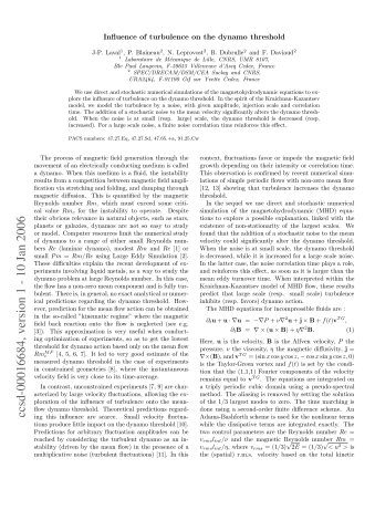 Résumé : We use direct and stochastic numerical simulations of the magnetohydrodynamic equations to explore the influence of turbulence on the dynamo threshold. In the spirit of the Kraichnan-Kazantsev model, we model the turbulence by a noise, with given amplitude, injection scale and correlation time. The addition of a stochastic noise to the mean velocity significantly alters the dynamo threshold. When the noise is at small (resp. large) scale, the dynamo threshold is decreased (resp. increased). For a large scale noise, a finite correlation time reinforces this effect.