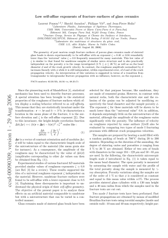 Résumé : The geometry of post mortem rough fracture surfaces of porous glass ceramics made of sintered glass beads is shown experimentally to be self-affine with an exponent zeta=0.40 (0.04) remarkably lower than the 'universal' value zeta=0.8 frequently measured for many materials. This low value of zeta is similar to that found for sandstone samples of similar micro structure and is also practically independent on the porosity phi in the range investigated (3% < phi < 26%) as well as on the bead diameter d and of the crack growth velocity. In contrast, the roughness amplitude normalized by d increases linearly with phi while it is still independent, within experimental error, of d and of the crack propagation velocity. An interpretation of this variation is suggested in terms of a transition from transgranular to intergranular fracture propagation with no influence, however, on the exponent zeta.