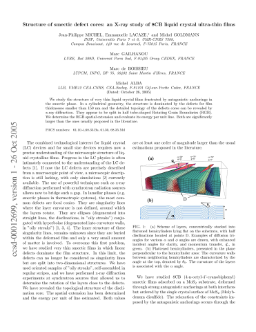 Résumé : We study the structure of very thin liquid crystal films frustrated by antagonistic anchorings in the smectic phase. In a cylindrical geometry, the structure is dominated by the defects for film thicknesses smaller than 150 nm and the detailed topology of the defects cores can be revealed by x-ray diffraction. They appear to be split in half tube-shaped Rotating Grain Boundaries (RGB). We determine the RGB spatial extension and evaluate its energy per unit line. Both are significantly larger than the ones usually proposed in the literature
