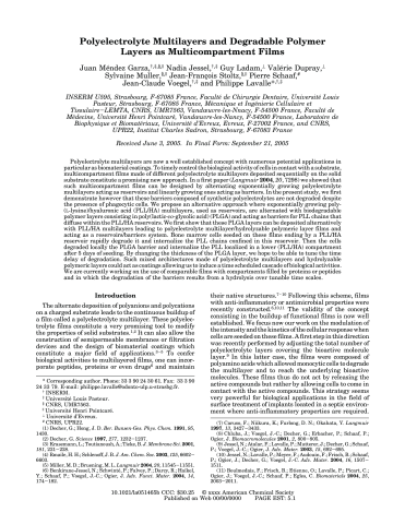 Résumé : Polyelectrolyte multilayers are now a well established concept with numerous potential applications in particular as biomaterial coatings. To timely control the biological activity of cells in contact with a substrate, multicompartment films made of different polyelectrolyte multilayers deposited sequentially on the solid substrate constitute a promising new approach. In a first paper (Langmuir 2004, 20, 7298) we showed that such multicompartment films can be designed by alternating exponentially growing polyelectrolyte multilayers acting as reservoirs and linearly growing ones acting as barriers. In the present study, we first demonstrate however that these barriers composed of synthetic polyelectrolytes are not degraded despite the presence of phagocytic cells. We propose an alternative approach where exponentially growing poly-(L-lysine)/hyaluronic acid (PLL/HA) multilayers, used as reservoirs, are alternated with biodegradable polymer layers consisting in poly(lactic-co-glycolic acid) (PLGA) and acting as barriers for PLL chains that diffuse within the PLL/HA reservoirs. We first show that these PLGA layers can be deposited alternatively with PLL/HA multilayers leading to polyelectrolyte multilayer/hydrolyzable polymeric layer films and acting as a reservoirs/barriers system. Bone marrow cells seeded on these films ending by a PLL/HA reservoir rapidly degrade it and internalize the PLL chains confined in this reservoir. Then the cells degraded locally the PLGA barrier and internalize the PLL localized in a lower (PLL/HA) compartment after 5 days of seeding. By changing the thickness of the PLGA layer, we hope to be able to tune the time delay of degradation. Such mixed architectures made of polyelectrolyte multilayers and hydrolyzable polymeric layers could act as coatings allowing us to induce a time scheduled cascade of biological activities. We are currently working on the use of comparable films with compartments filled by proteins or peptides and in which the degradation of the barriers results from a hydrolysis over tunable time scales.