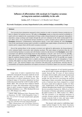 Résumé : Fast growing forest plantations managed in short rotations in order to maximize biomass production are likely to deplete soil nutrient reserves. The effects of Eucalyptus stands on long-term nutrient availability in sandy soils were studied in the coastal plains of Congo, using a biogeochemical cycle approach. Atmospheric deposition, canopy exchange and transfer through the soil were estimated on the whole rooting depth (6 m) over three years, in an experimental design installed in a native savanna and an adjacent 6-year-old Eucalyptus plantation. Complementary measurements during 3 years after planting the same Eucalyptus clone in the experimental savanna made it possible to establish input-output budgets of nutrients for the whole rotation and to compare them with the native savanna ecosystem. Even if the nutrient fluxes in the savanna ecosystem were affected by afforestation, the biogeochemical cycles remained highly conservative after planting eucalypts. The main outputs of nutrients from the soil occurred during burning in savanna and with biomass removal at the harvest in the Eucalyptus stand. Both ecosystems were efficient in preventing losses by deep drainage (<5 kg ha-1 year-1 for N, P, K, Ca, and Mg). After afforestation, weeding in the Eucalyptus stands eliminated the leguminous species responsible for N input by symbiotic fixation of about 20 kg ha-1 year-1. Whereas the budgets of P, K, Ca and Mg were roughly balanced, the current silviculture led to a deficit of about 140 kg N ha-1 in the soil, throughout a 7-year rotation. This deficit was large relative to the pool of total N in the upper soil layer (0-50 cm), which was about 2 t ha-1. The nutrient budgets were consistent with field trials on fertilization, showing that the sustainability of Congolese plantations will require an increase in N fertilizer inputs over successive rotations.