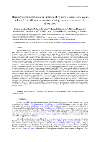 Résumé : High variability among individuals is often encountered when hemocyte characteristics are measured in bivalves. Such variability is suspected to result partly from genetic factors. In this study, hemocyte characteristics of six families of Crassostrea gigas were compared by flow cytometry at one sampling date in October 2001. These families were obtained from a nested, halfsibling cross design, and reared from July to October 2001 at three sites distributed along the French Atlantic coast from north to south: Baie des Veys (Normandy), Rivière d'Auray (Brittany) and Ronce (Marennes-oléron Basin, Poitou Charentes). Among the 15 measured hemocyte characteristics, production of reactive oxygen species (ROS) of untreated hemocytes (maintained in filtered sterile seawater) and treated hemocytes (zymosan at 20 particles per hemocyte, and with Vibrio sp. S322 at 50 bacteria per hemocyte) was the most notable differences between families. This supports the existence of a genetic basis, at least partly, for the hemocyte characteristics of oysters, and especially for ROS production. Among the six families analyzed, three have shown high survival during summer (named as "resistant", mean mortality 5.2%) and three experienced high mortality during summer (named as "susceptible", 30.6% mean mortality). Families showing high or low survival to summer mortality had similar hemocyte characteristics, regardless of the environmental conditions or reproductive state. Resistant families were observed to have higher total hemocyte counts and lower production of ROS than susceptible families. Moreover, ROS production of hemocytes from susceptible families was diminished significantly more by pathogenic Vibrio than that of resistant families. However, this study demonstrates also that rearing site strongly affected the hemocyte characteristics of all families of oysters, most notably hemocyte concentration and morphology (size and granularity), production of reactive oxygen species (ROS), and susceptibility to the cytotoxic activity of the pathogenic Vibrio sp. S322 (50 bacteria/ hemocyte). Food availability and reproductive state are the most probable explanations for the site differences observed. Finally, it appeared difficult to link oyster survival during summer mortality to hemocyte profiles evaluated at one sampling date; other relevant indicators would probably help explaining oyster survival during summer mortality events.