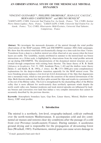 Résumé : We investigate the mesoscale dynamics of the mistral through the wind profiler observations of the MAP (autumn 1999) and ESCOMPTE (summer 2001) field campaigns. We show that the mistral wind field can dramatically change on a time scale less than 3 hours. Transitions from a deep to a shallow mistral are often observed at any season when the lower layers are stable. The variability, mainly attributed in summer to the mistral/land–sea breeze interactions on a 10-km scale, is highlighted by observations from the wind profiler network set up during ESCOMPTE. The interpretations of the dynamical mistral structure are performed through comparisons with existing basic theories. The linear theory of R. B. Smith [Advances in Geophysics, Vol. 31, 1989, Academic Press, 1–41] and the shallow water theory [Schär, C. and Smith, R. B.: 1993a, J. Atmos. Sci. 50, 1373–1400] give some complementary explanations for the deep-to-shallow transition especially for the MAP mistral event. The wave breaking process induces a low-level jet (LLJ) downstream of the Alps that degenerates into a mountain wake, which in turn provokes the cessation of the mistral downstream of the Alps. Both theories indicate that the flow splits around the Alps and results in a persistent LLJ at the exit of the Rhône valley. The LLJ is strengthened by the channelling effect of the Rhône valley that is more efficient for north-easterly than northerly upstream winds despite the north–south valley axis. Summer moderate and weak mistral episodes are influenced by land–sea breezes and convection over land that induce a very complex interaction that cannot be accurately described by the previous theories.