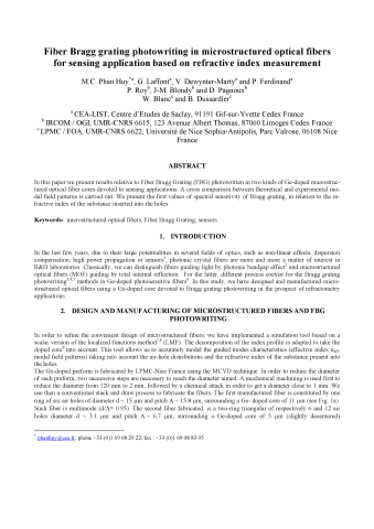 Résumé : In this paper we present results relative to Fiber Bragg Grating (FBG) photowritten in two kinds of Ge-doped microstructured optical fiber cores devoted to sensing applications. A cross comparison between theoretical and experimental modal field patterns is carried out. We present the first values of spectral sensitivity of Bragg grating, in relation to the refractive index of the substance inserted into the holes.