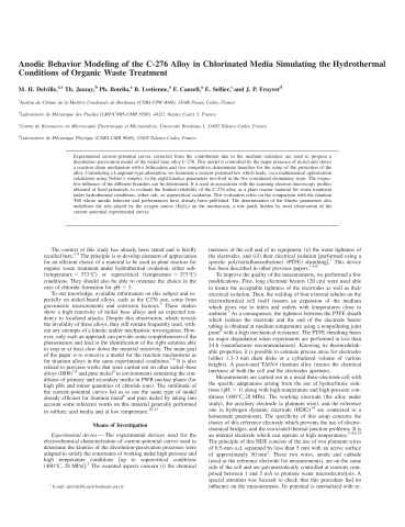 Résumé : Experimental current–potential curves corrected from the contribution due to the medium oxidation are used to propose a dissolution–passivation model of the nickel base alloy C-276. This model is controlled by the major presence of nickel and shows a reaction chain mechanism with a bifurcation and two competitive determinant branches for the setup of the protection of the alloy. Considering a Langmuir-type adsorption, we formulate a current–potential law which leads, via a mathematical optimization calculation using Nelder's simplex, to the eight kinetics parameters involved in the five considered elementary steps. The respective influence of the different branches can be determined. It is used in association with the scanning electron microscopy profiles obtained at fixed potentials, to evaluate the limited reliability of the C-276 alloy as a plant reactor material for waste treatment under hydrothermal conditions, either sub- or supercritical oxidation. This evaluation relies on the comparison with the titanium T60 whose anodic behavior and performances have already been published. The determination of the kinetic parameters also underlines the role played by the oxygen source (H2O2) on the mechanism, a role partly hidden by strict observation of the current–potential experimental curves.