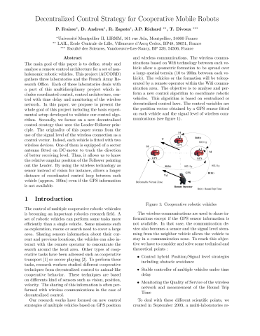 Résumé : The main goal of this paper is to define, study and analyse a remote control architecture for a set of non- holonomic robotic vehicles. This project (ACCORD) gathers three laboratories and the French Army Re- search Office. Each of these laboratories deals with a part of this multidisciplinary project which in- cludes coordinated control, control architecture, con- trol with time delay and monitoring of the wireless network. In this paper, we propose to present the whole goal of this project including the basis experi- mental setup developed to validate our control algo- rithm. Secondly, we focuse on a new decentralized control strategy that uses the Leader-Follower prin- ciple. The originality of this paper stems from the use of the signal level of the wireless connection as a control vector. Indeed, each vehicle is fitted with two wireless devices. One of them is equipped of a sector antenna fitted on DC-motor to track the direction of better receiving level. Thus, it allows us to know the relative angular position of the Follower pointing out the Leader. By using the wireless technology as sensor instead of vision for instance, allows a longer distance of coordinated control loop between each vehicle (approx. 100m) even if the GPS information is not available.