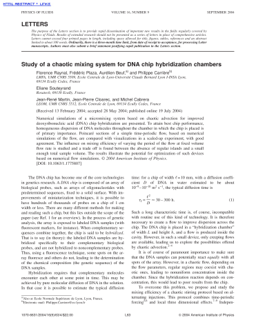 Résumé : Numerical simulations of a micromixing system based on chaotic advection for improved deoxyribonucleic acid (DNA) chip hybridization are presented. To attain best chip performance, homogeneous dispersion of DNA molecules throughout the chamber in which the chip is placed is of primary importance. Poincaré sections of a simple time-periodic flow, based on numerical simulations of the flow, are compared with visualizations in a scaled-up experiment, with good agreement. The influence on mixing efficiency of varying the period of the flow at fixed volume flow rate is studied and a trade off is found between the absence of regular islands and a small enough total sample volume. The results illustrate the potential for optimization of such devices based on numerical flow simulations. The DNA chip has become one of the core technologies in genetics research. A DNA chip is composed of an array of biological probes, such as arrays of oligonucleotides with predetermined sequences, fixed to a solid surface. With improvements of miniaturization techniques, it is possible to have hundreds of thousands of probes on a chip of 1 cm width or less. There are many different methods for making and reading such a chip, but this lies outside the scope of the paper (see Ref. 1 for an overview). In the process of genetic analysis, the array is exposed to labeled DNA samples (with fluorescent markers, for instance). When complementary sequences combine together, the chip is said to be hybridized. That is to say (in theory): the labeled DNA samples are hy-bridized specifically to their complementary biological probes, and are not hybridized to noncomplementary probes. Thus, using a fluorescence technique, some spots on the array fluoresce and others do not, leading to the determination of the chemical composition (the genetic sequence) of the DNA samples. Hybridization requires that complementary molecules encounter each other at some point in time. This may be achieved by pure molecular diffusion of DNA in the solution. In that case it is possible to estimate the typical diffusion