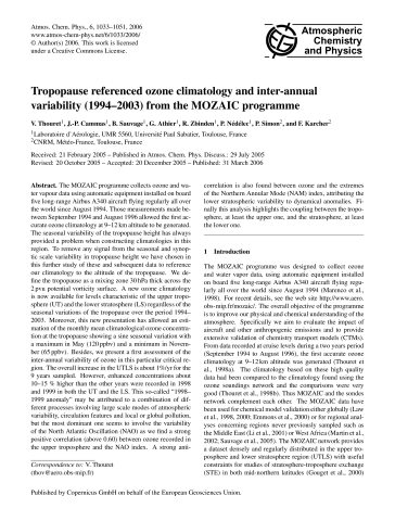 Résumé : The MOZAIC programme collects ozone and water vapour data using automatic equipment installed on board five long-range Airbus A340 aircraft flying regularly all over the world since August 1994. Those measurements made between September 1994 and August 1996 allowed the first accurate ozone climatology at 9–12 km altitude to be generated. The seasonal variability of the tropopause height has always provided a problem when constructing climatologies in this region. To remove any signal from the seasonal and synoptic scale variability in tropopause height we have chosen in this further study of these and subsequent data to reference our climatology to the altitude of the tropopause. We define the tropopause as a mixing zone 30 hPa thick across the 2 pvu potential vorticity surface. A new ozone climatology is now available for levels characteristic of the upper troposphere (UT) and the lower stratosphere (LS) regardless of the seasonal variations of the tropopause over the period 1994–2003. Moreover, this new presentation has allowed an estimation of the monthly mean climatological ozone concentration at the tropopause showing a sine seasonal variation with a maximum in May (120 ppbv) and a minimum in November (65 ppbv). Besides, we present a first assessment of the inter-annual variability of ozone in this particular critical region. The overall increase in the UTLS is about 1%/yr for the 9 years sampled. However, enhanced concentrations about 10–15 % higher than the other years were recorded in 1998 and 1999 in both the UT and the LS. This so-called "1998–1999 anomaly" may be attributed to a combination of different processes involving large scale modes of atmospheric variability, circulation features and local or global pollution, but the most dominant one seems to involve the variability of the North Atlantic Oscillation (NAO) as we find a strong positive correlation (above 0.60) between ozone recorded in the upper troposphere and the NAO index. A strong anti-correlation is also found between ozone and the extremes of the Northern Annular Mode (NAM) index, attributing the lower stratospheric variability to dynamical anomalies. Finally this analysis highlights the coupling between the troposphere, at least the upper one, and the stratosphere, at least the lower one.