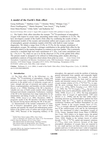 Résumé : [1] The Earth's Dole effect describes the isotopic 18 O/ 16 O-enrichment of atmospheric oxygen with respect to ocean water, amounting under today's conditions to 23.5%. We have developed a model of the Earth's Dole effect by combining the results of three-dimensional models of the oceanic and terrestrial carbon and oxygen cycles with results of atmospheric general circulation models (AGCMs) with built-in water isotope diagnostics. We obtain a range from 22.4% to 23.3% for the isotopic enrichment of atmospheric oxygen. We estimate a stronger contribution to the global Dole effect by the terrestrial relative to the marine biosphere in contrast to previous studies. This is primarily caused by a modeled high leaf water enrichment of 5-6%. Leaf water enrichment rises by $1% to 6-7% when we use it to fit the observed 23.5% of the global Dole effect. The present model is designed to be utilized in forthcoming paleo studies allowing a quantitative analysis of long-term observations from polar ice cores.