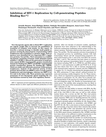 Résumé : New therapeutic agents able to block HIV-1 replication are eagerly sought after to increase the possibilities of treatment of resistant viral strains. In this report, we describe a rational strategy to identify small peptide sequences owning the dual property of penetrating within lymphocytes and of binding to a protein target. Such sequences were identified for two important HIV-1 regulatory proteins, Tat and Rev. Their association to a stabilizing domain consisting of human small ubiquitin-related modifier-1 (SUMO-1) allowed the generation of small proteins named SUMO-1 heptapeptide protein transduction domain for binding Tat (SHPT) and SUMO-1 heptapeptide protein transduction domain for binding Rev (SHPR), which are stable and efficiently penetrate within primary lymphocytes. Analysis of the antiviral activity of these proteins showed that one SHPR is active in both primary lymphocytes and macrophages, whereas one SHPT is active only in the latter cells. These proteins may represent prototypes of new therapeutic agents targeting the crucial functions exerted by both viral regulatory factors.