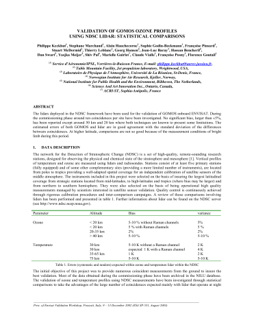 Résumé : The lidars deployed in the NDSC framework have been used for the validation of GOMOS onboard ENVISAT. During the commissioning phase around ten coincidences per site have been investigated. No significant bias, larger than ±5%, has been reported except around 50 km and 20 km where both techniques are known to present some limitations. The estimated errors of both GOMOS and lidar are in good agreement with the standard deviation of the differences between coincidences. At higher latitude, comparisons are not so good because of the measurement conditions of bright limb during this period.