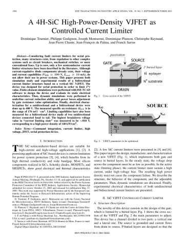 Résumé : Considering fault current limiters for serial protection, many structures exist, from regulation to other complex systems such as circuit breakers, mechanical switches, or more conventional fuses. Up to now, only a few semiconductor current limiter structures have been described in the literature. Although current-regulative diode components already exist, their voltage and current capabilities (V-BR = 100 V, I-max = 10 mA), do not allow their use in power systems. This paper presents both simulation study and experimental results of a bidirectional current limiter structure based on a vertical SiC VJFET. The device was designed for serial protection in order to limit I(2)t value. Finite-element simulations were performed with ISE-TCAD software to design the device and evaluate its static electrical characteristics. Then, dynamic simulations were performed to underline current reduction ability and power losses adjustment by gate resistance value optimization. Finally, electrical characterization for a unidirectional and a bidirectional device were done up to 400 V. The measured specific on resistance R-ON is in the range of 176 mOmega.cm(2). Limiting capabilities have also been measured for a bidirectional device made of two unidirectional devices connected head to tail. The highest breakdown voltage value in "current limiting state" was measured to be similar to810 V, corresponding to a high power density of 140 kW/cm(2).