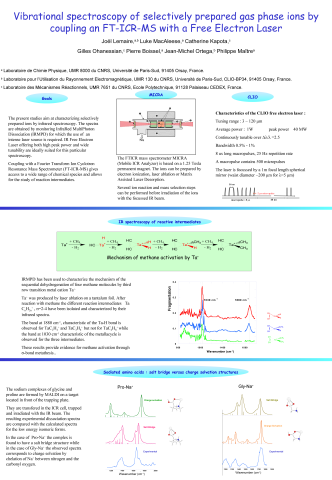 Résumé : The present studies aim at characterizing selectively prepared ions by infrared spectroscopy. The spectra are obtained by monitoring InfraRed MultiPhoton Dissociation (IRMPD) for which the use of an intense laser source is required. IR Free Electron Laser offering both high peak power and wide tunability are ideally suited for this particular spectroscopy. Coupling with a Fourier Transform Ion Cyclotron Resonance Mass Spectrometer (FT-ICR-MS) gives access to a wide range of chemical species and allows for the study of reaction intermediates.