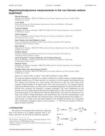 Résumé : We study the magnetic induction in a confined swirling flow of liquid sodium, at integral magnetic Reynolds numbers up to 50. More precisely, we measure in situ the magnetic field induced by the flow motion in the presence of a weak external field. Because of the very small value of the magnetic Prandtl number of all liquid metals, flows with even modest R-m are strongly turbulent. Large mean induction effects are observed over a fluctuating background. As expected from the von Karman flow geometry, the induction is strongly anisotropic. The main contributions are the generation of an azimuthal induced field when the applied field is in the axial direction (an Omega effect) and the generation of axial induced field when the applied field is the transverse direction (as in a large scale alpha effect). Strong fluctuations of the induced field, due to the flow nonstationarity, occur over time scales slower than the flow forcing frequency. In the spectral domain, they display a f(-1) spectral slope. At smaller scales (and larger frequencies) the turbulent fluctuations are in agreement with a Kolmogorov modeling of passive vector dynamics.