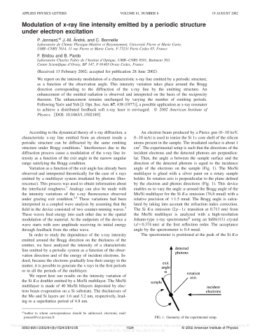 Résumé : We report on the intensity modulation of a characteristic x-ray line emitted by a periodic structure, as a function of the observation angle. This intensity variation takes place around the Bragg direction corresponding to the diffraction of the x-ray line by the emitting structure. An enhancement of the emitted radiation is observed and interpreted on the basis of the reciprocity theorem. The enhancement remains unchanged by varying the number of emitting periods. Following Yariv and Yeh [J. Opt. Soc. Am. 67, 438 (1977)], a possible application as x-ray resonator to achieve a distributed feedback soft x-ray laser is envisaged.